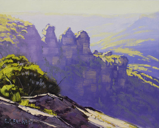 three sisters, blue mountains, grose valley, mountain landscape , morning light, cliffs , Australian painting, katoomba,