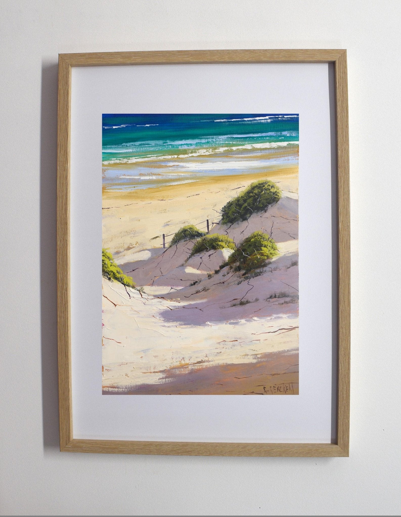 Capture the essence of Australia's stunning coastline with this framed oil painting by Graham Gercken. The artwork beautifully portrays serene beach dunes, showcasing the natural beauty of Australia's shorelines with rich textures and vibrant colors.