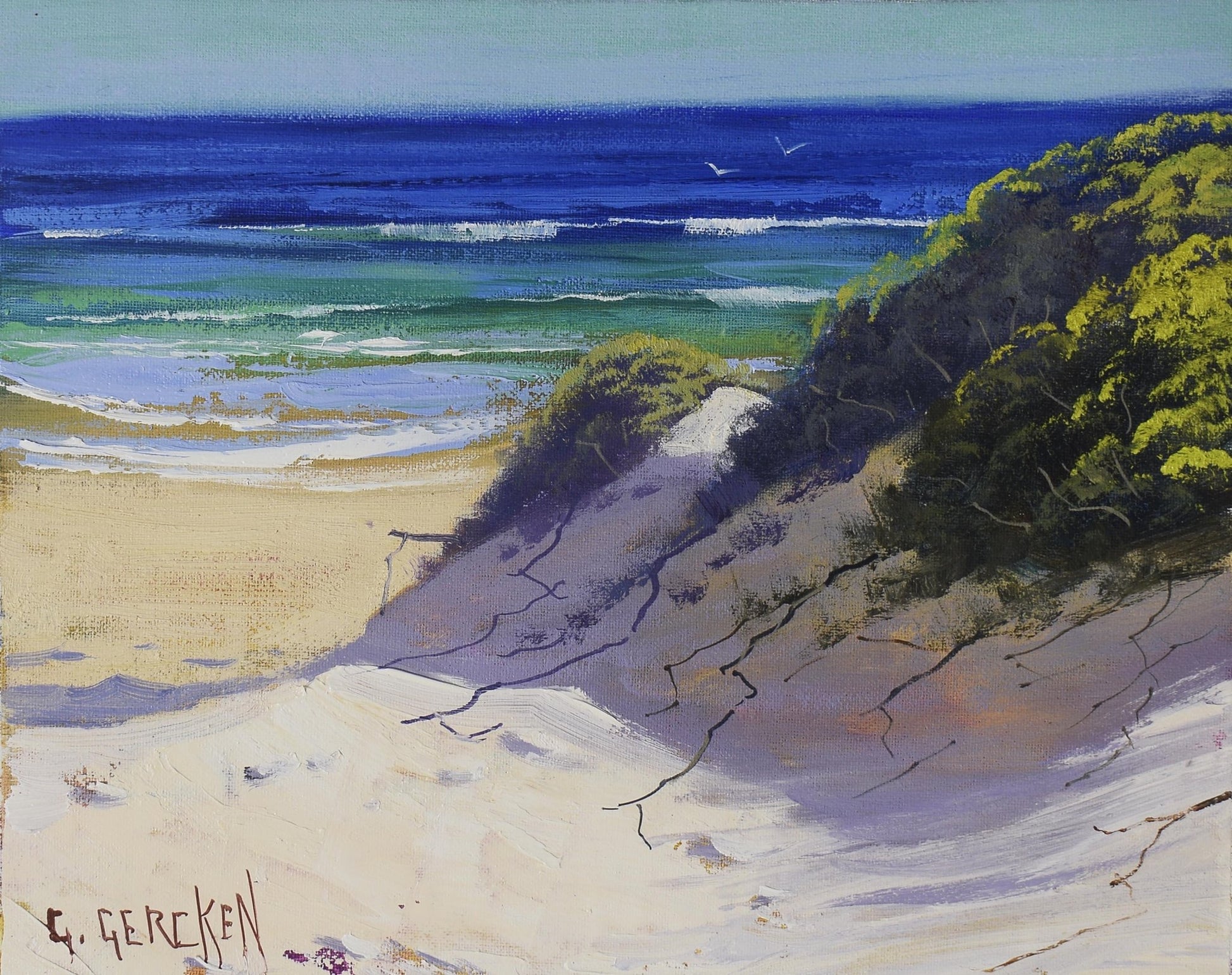 Immerse yourself in the serene beauty of Australia's Central Coast with this captivating framed oil painting by Graham Gercken. The artwork masterfully captures the tranquil beach landscape, featuring gentle sand dunes that lead to the shoreline. Each brushstroke brings the coastal atmosphere to life, making this original piece a perfect addition to your home or office space.