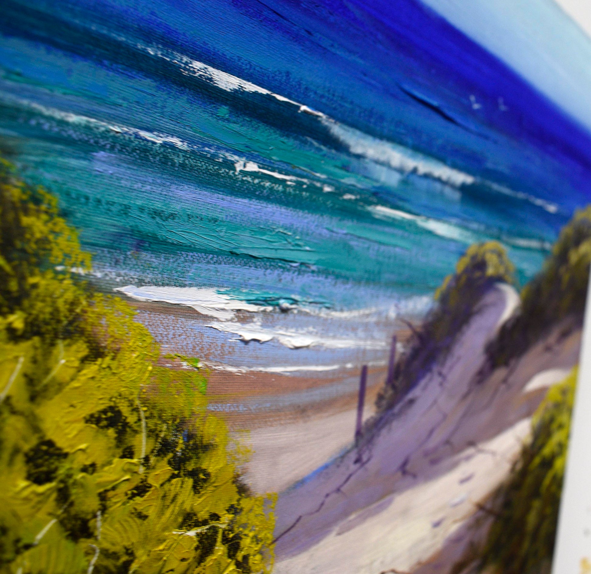 Enhance your home decor with an original, hand-painted Central Coast Beach Painting by Graham Gercken. This beautiful 16x12 inch oil painting captures the essence of a sunny day on the coast of New South Wales, Australia. Ready to hang, this painting will bring a touch of tranquility to any room.