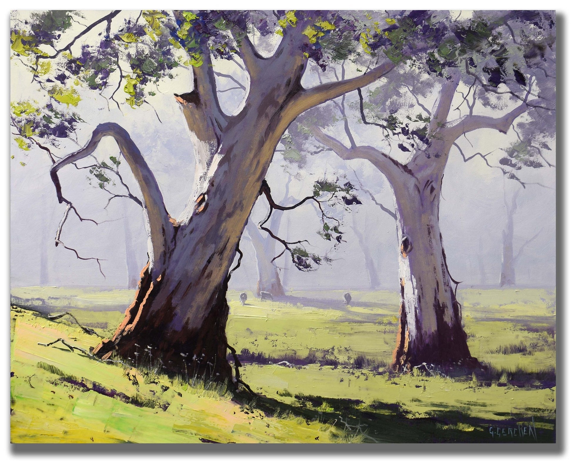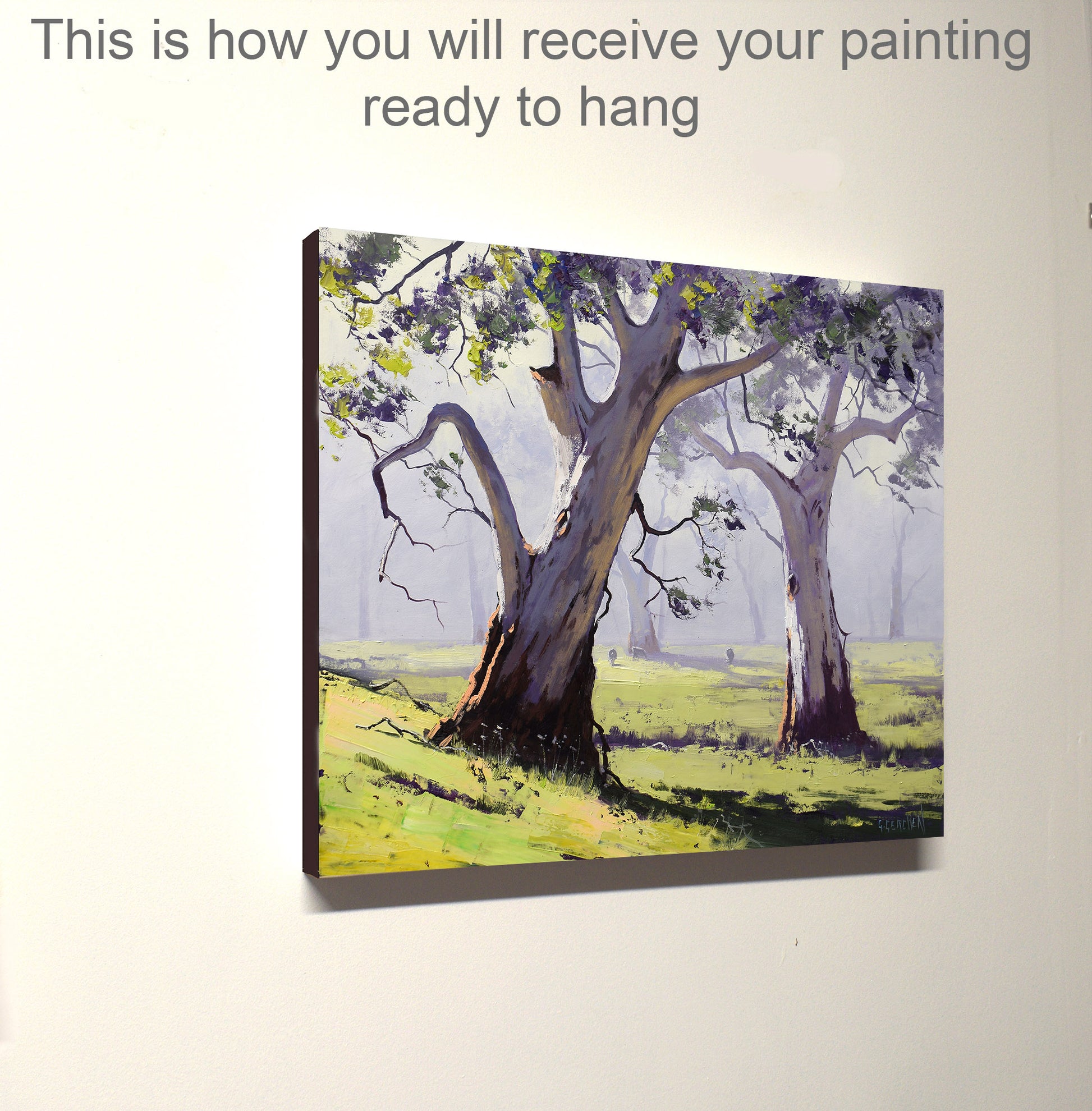 This beautiful original oil painting by Graham Gercken portrays the quiet majesty of Australian gum trees bathed in soft morning light. With confident palette-knife textures and subtle colour transitions, the artist captures both the strength and serenity of the eucalyptus forest.