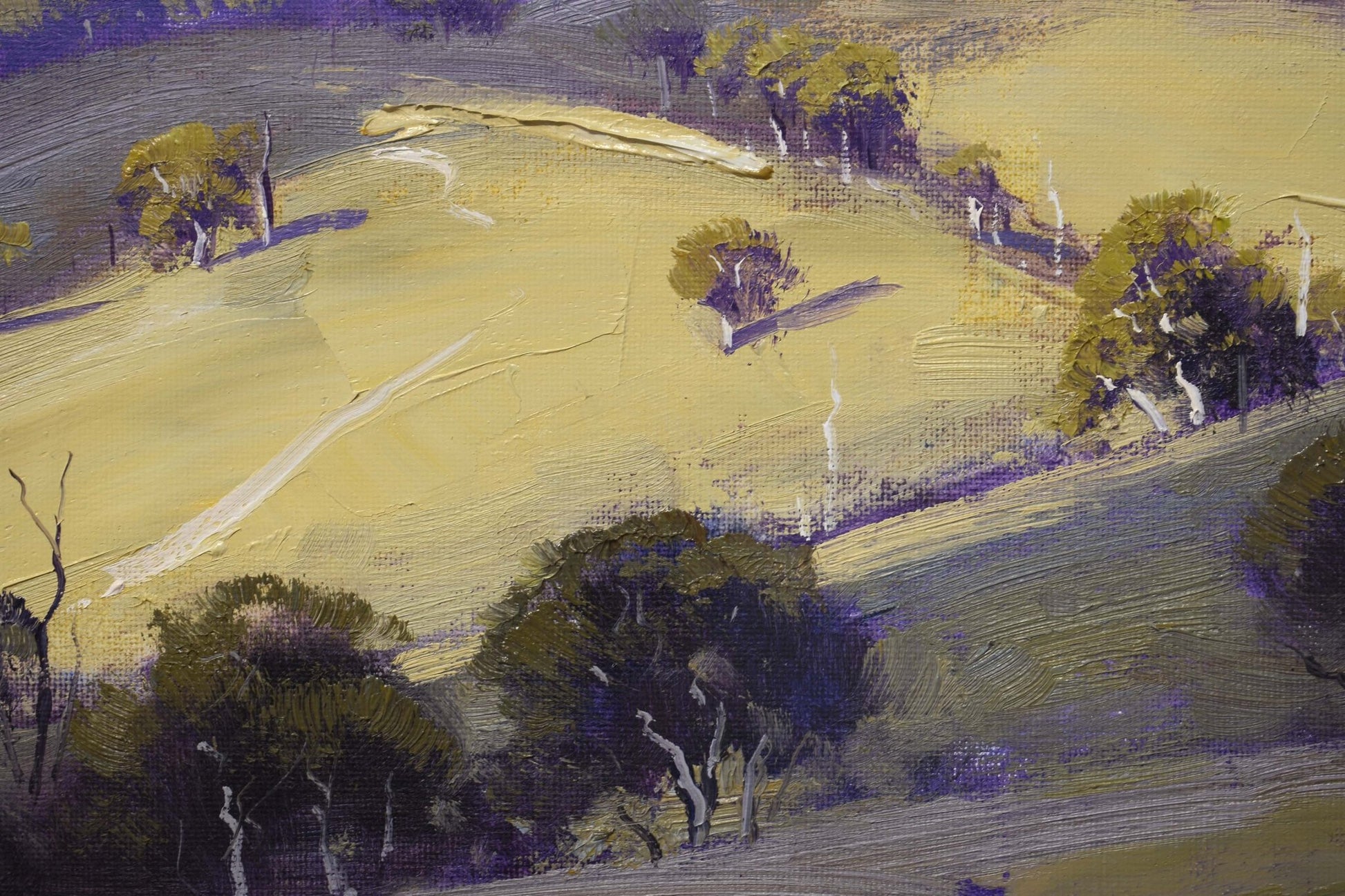 Original framed landscape painting of Kanimbla Valley in the Blue Mountains, NSW. This oil painting captures rolling sunlit hills, native bushland and distant escarpments in soft violet, green and golden tones. A one-of-a-kind Australian artwork, professionally framed and ready to hang, ideal for collectors of Blue Mountains and Australian landscape art.