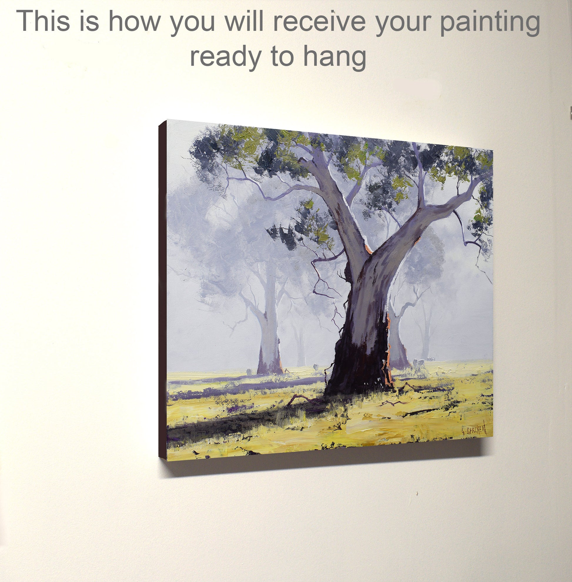 This original oil painting captures the quiet beauty of Australian gum trees emerging through soft morning mist. Strong trunks anchor the composition while diffused light and subtle tonal contrasts create a sense of depth, calm, and atmosphere across the landscape.