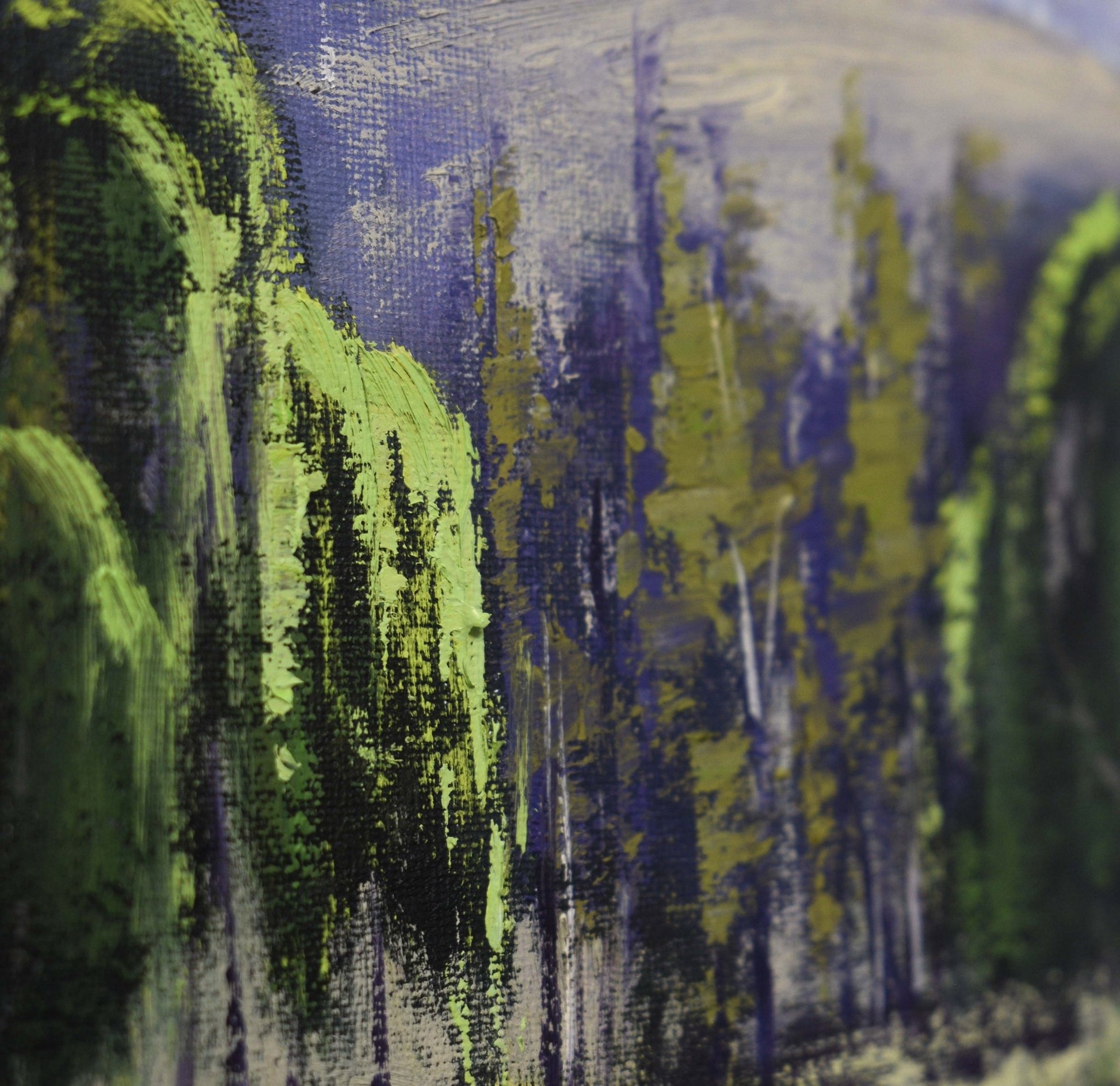 Painted in oils with confident, textural strokes, this work conveys a sense of peace and space, inviting the viewer to linger. The harmonious balance of cool blues, earthy greens and warm highlights gives the painting both freshness and depth.