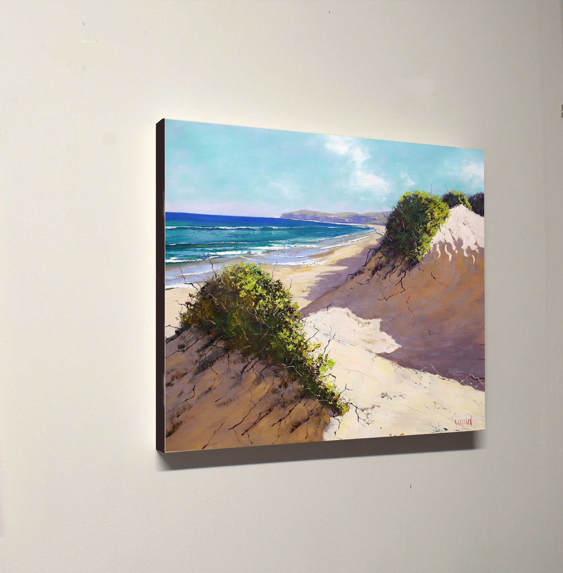 This beautiful oil painting by Grahm Gercken captures the essence of the Central Coast beach in NSW. The interplay of light and shadows across the sand dunes brings a sense of peace and tranquility to any room. Measuring 24x30 inches and ready to hang, this piece is a must-have for any art lover.