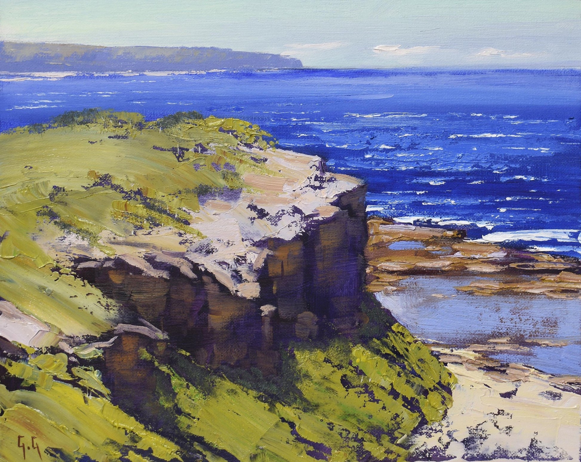 This original oil painting captures the rugged, vertical cliffs of Swansea Headland in New South Wales. The viewer looks out over a grassy green precipice toward a deep, textured blue ocean characterized by white-capped waves. The sunlight strikes the rock face, revealing layers of earthy browns and purples, while a distant headland sits softly on the hazy horizon under a pale, clear sky.