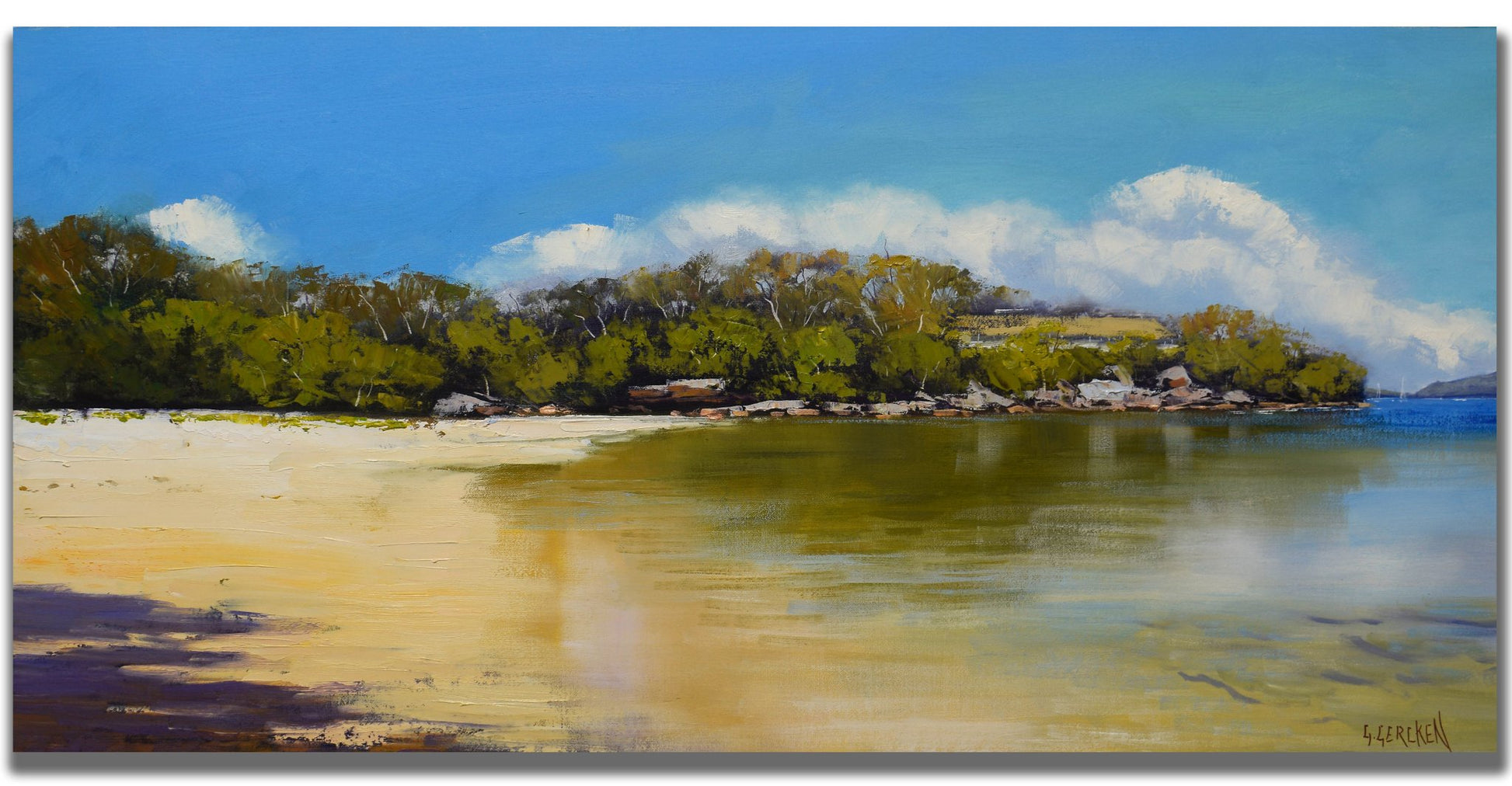 The artist's distinctive impasto technique brings a wonderful texture to the rolling clouds in the vibrant blue sky and the dense foliage of the trees. The foreground features smooth, reflective water, picking up the rich blues of the sky and the warm tones of the sand, creating a sense of depth and tranquility. A glimpse of the expansive harbour and perhaps a distant headland adds to the iconic Australian feel.