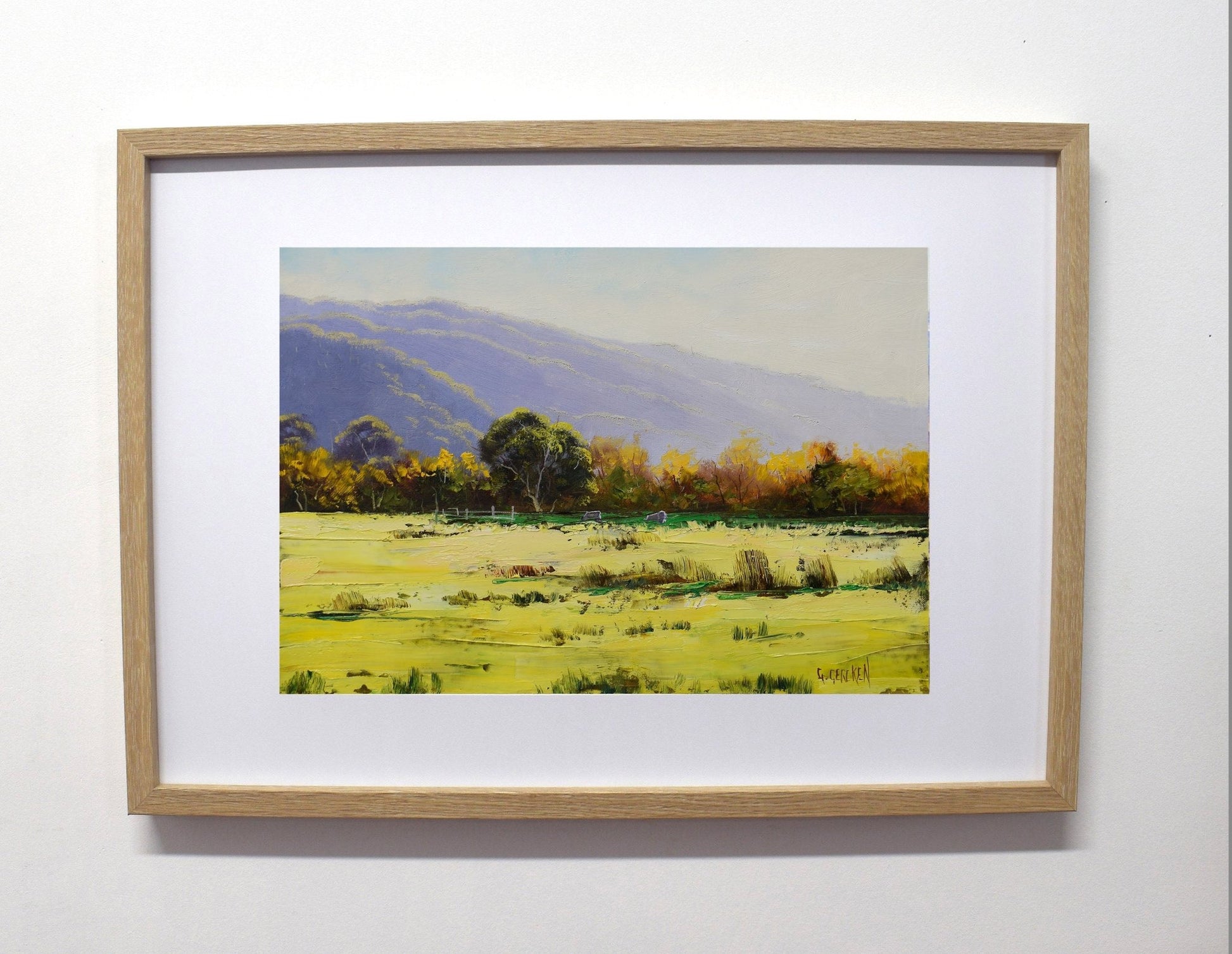 This original framed oil painting by award-winning Australian artist Graham Gercken captures the warm afternoon light over Tumut, NSW. With Autumn trees, golden tones, and tranquil countryside scenery, the artwork reflects the charm of the Australian landscape. Painted in professional oils and presented in a natural wood frame with a white mat, it is ready to hang and ideal for collectors of fine Australian art.